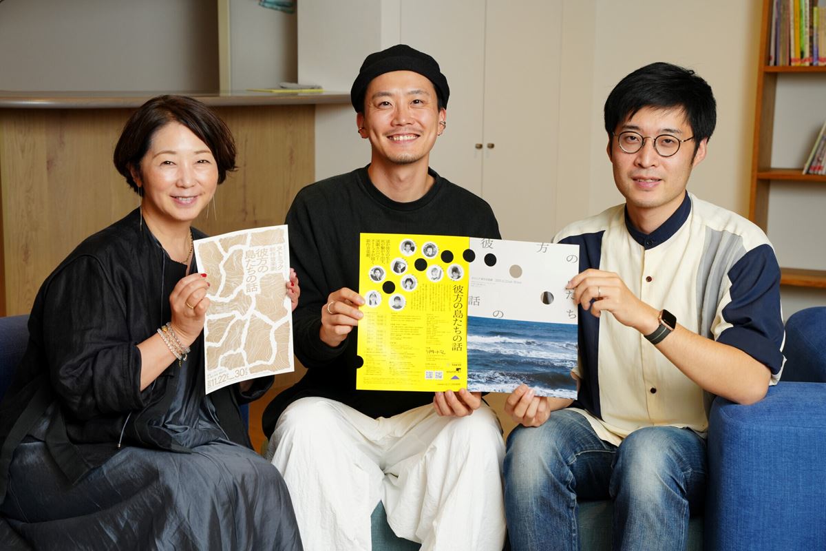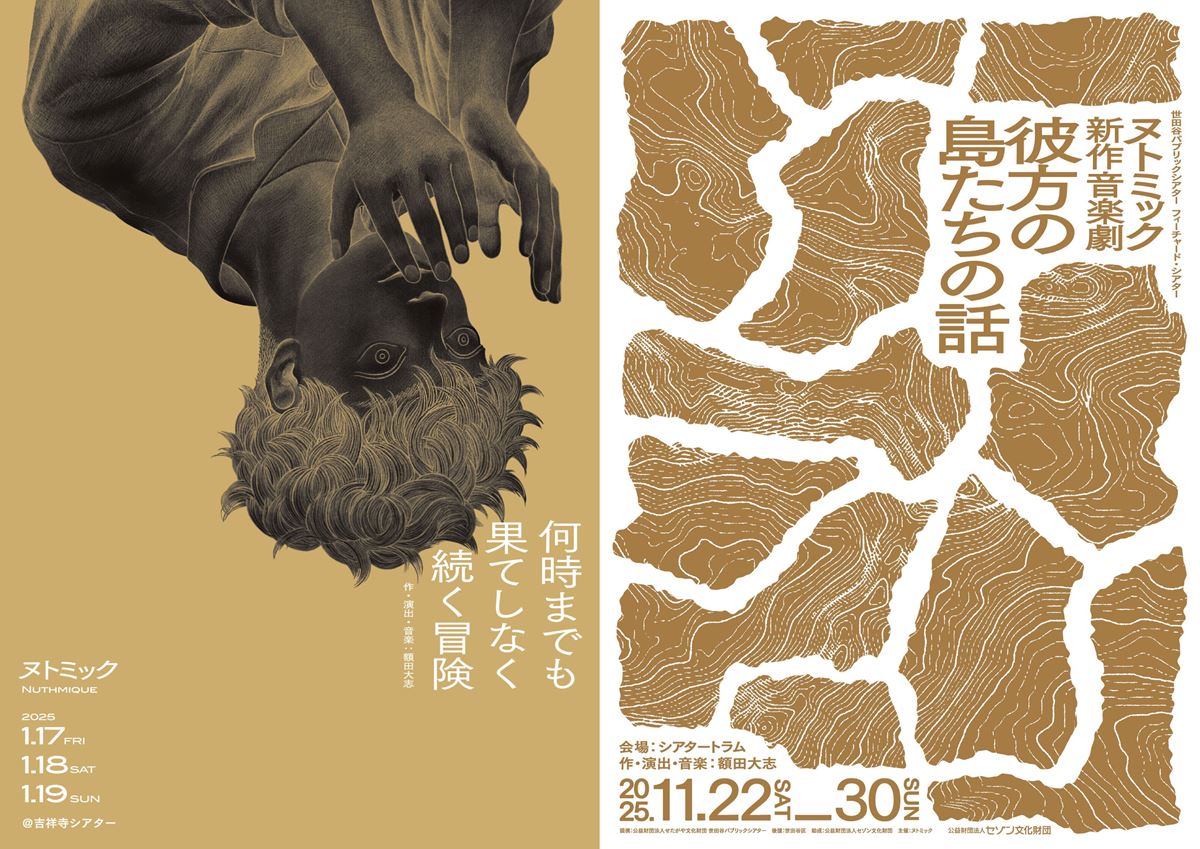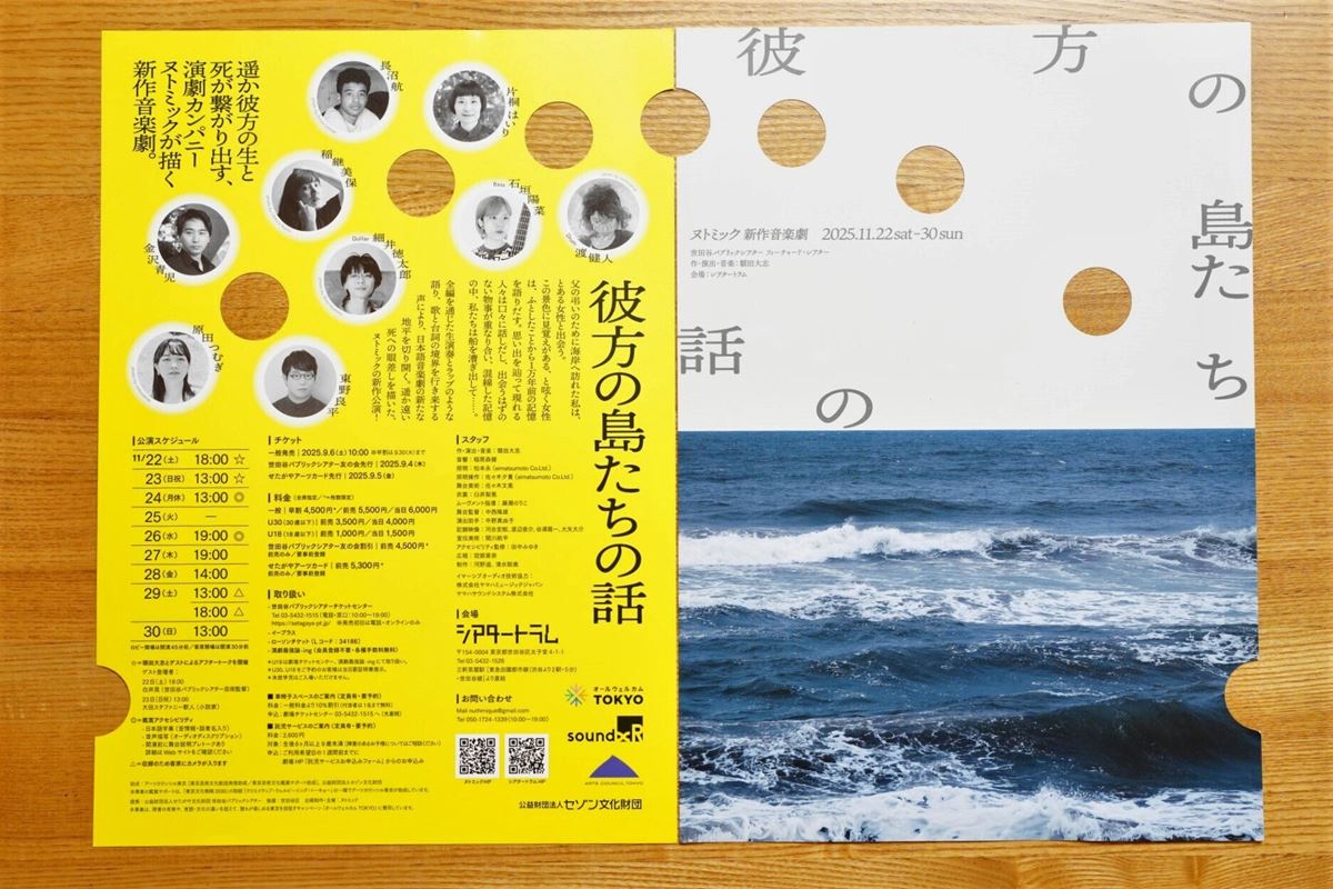 下半分に海の写真。ところどころに丸い穴が、実際に空いています。落ち着いた雰囲気ながらグッと目を惹くヌトミック『彼方の島たちの話』。主宰であり、作・演出・音楽を担当する額田大志さんと、デザイナー関川航平さんにお話を聞きました。