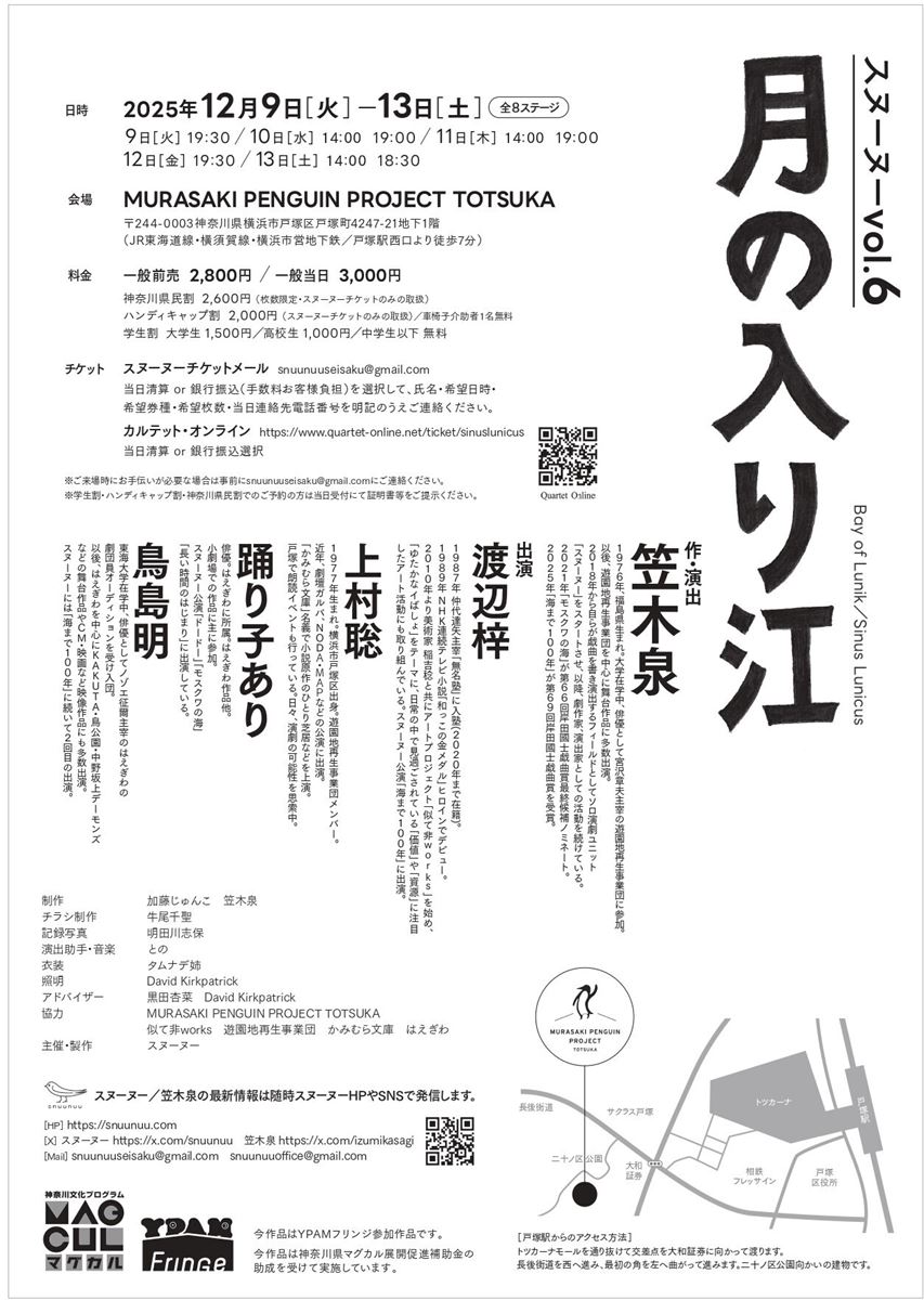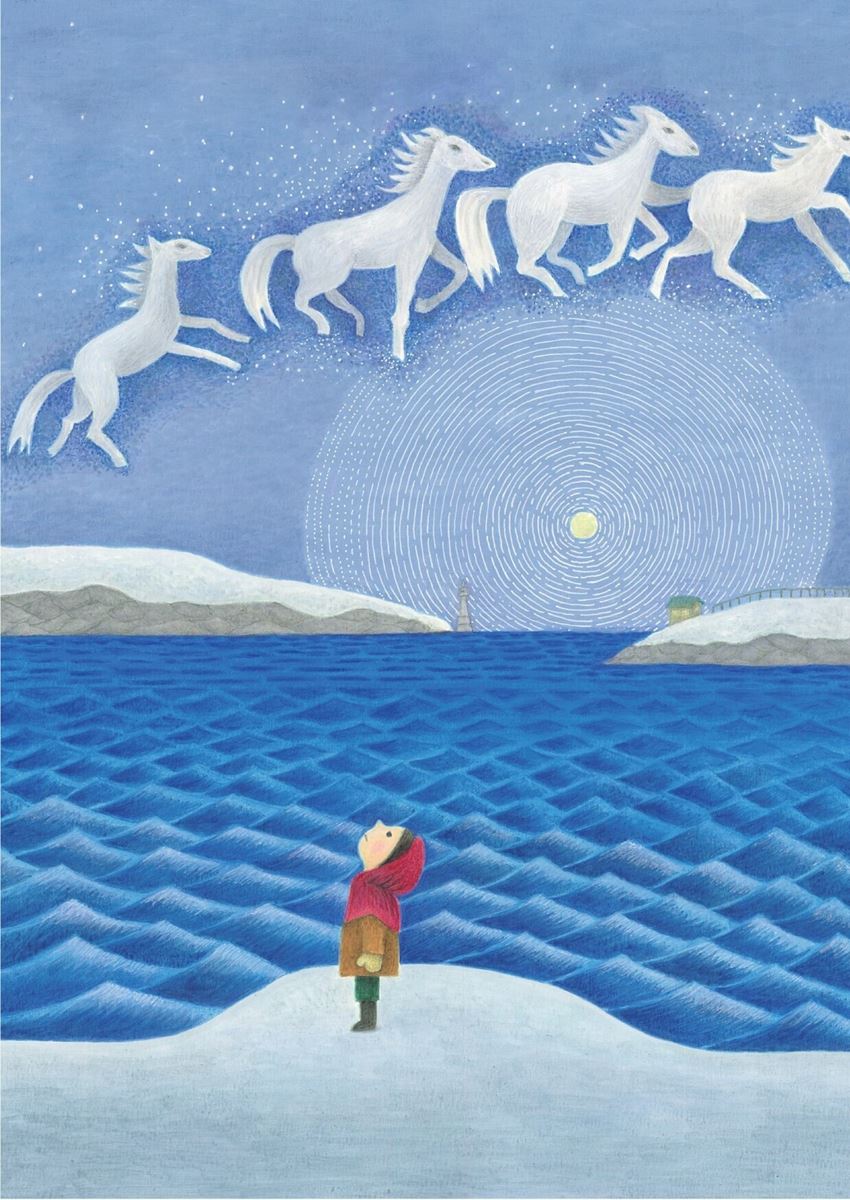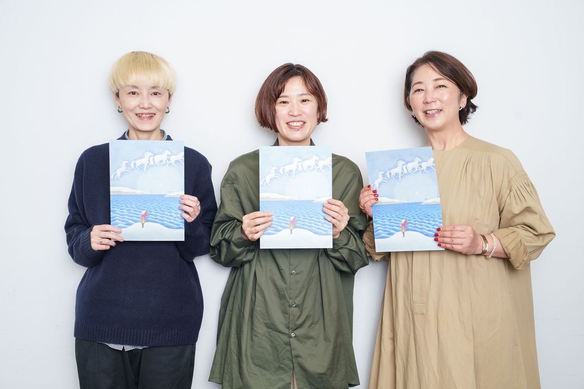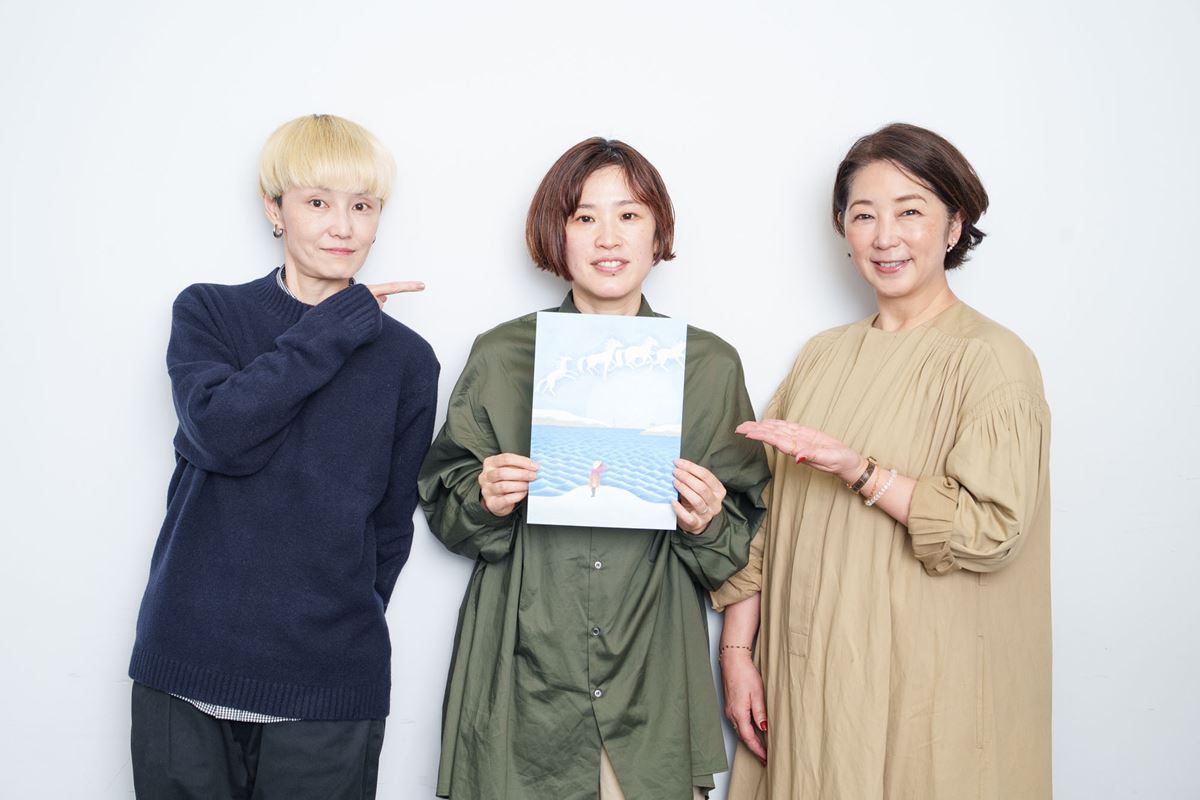 雪が積もる海辺で、空を翔ける馬たち。それを見上げる子ども。寂しさと温かさが入り混じるようなこの絵の上には、タイトルどころか一文字も字が書かれていません。とにかくこの絵そのものを見てほしいという気持ちがあふれんばかりに伝わってくるこのチラシは、スヌーヌーの岸田國士戯曲賞受賞後第一作『月の入り江』。作・演出の笠木泉さんと、イラストを手がける牛尾千聖さんにお話を聞きました。