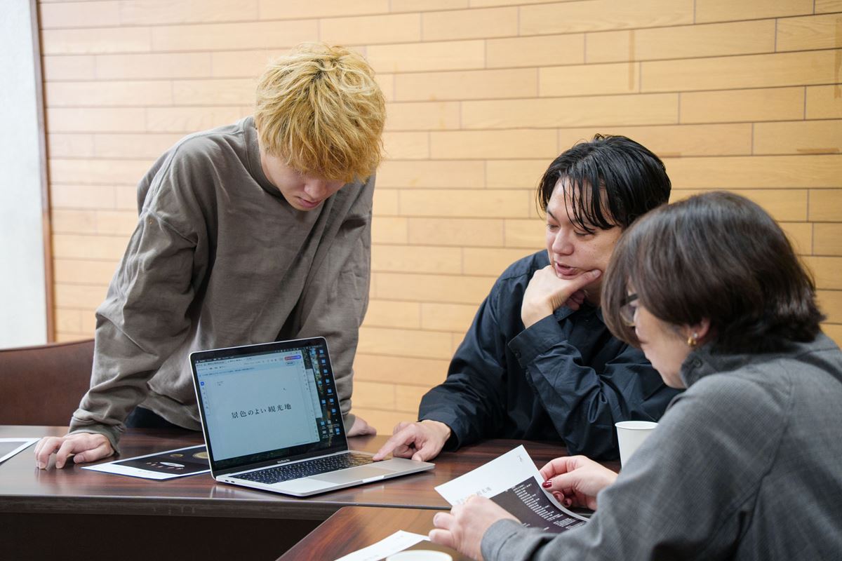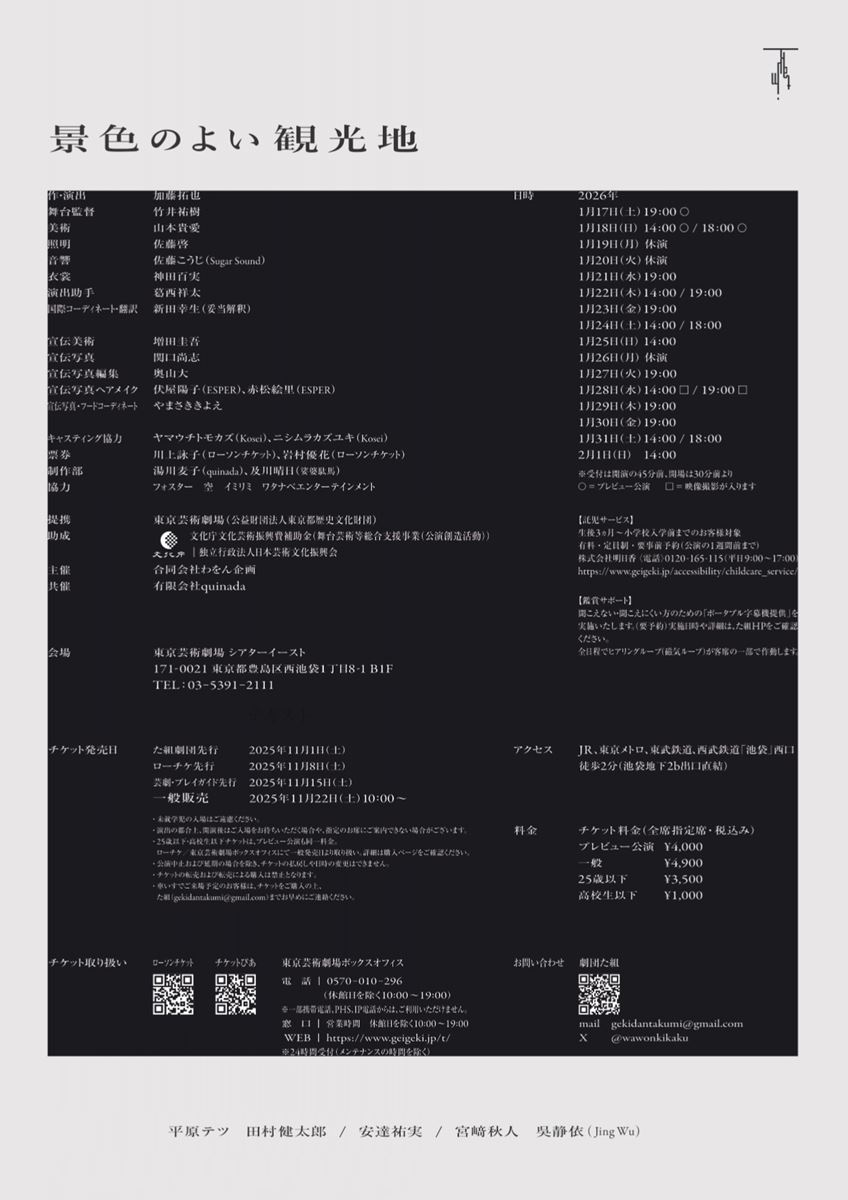 暗闇の中でテーブルを囲む5人の男女。首と手もとだけが浮かび上がって見えて、どこか不気味です。その写真の下には、どうやら上で彼らが手を伸ばそうとしているらしい皿の様子が。見る者の心をざわつかせるような『景色のよい観光地』のチラシについて、た組の作・演出を務める加藤拓也さんと、デザイナーの増田圭吾さんにお話を聞きました。