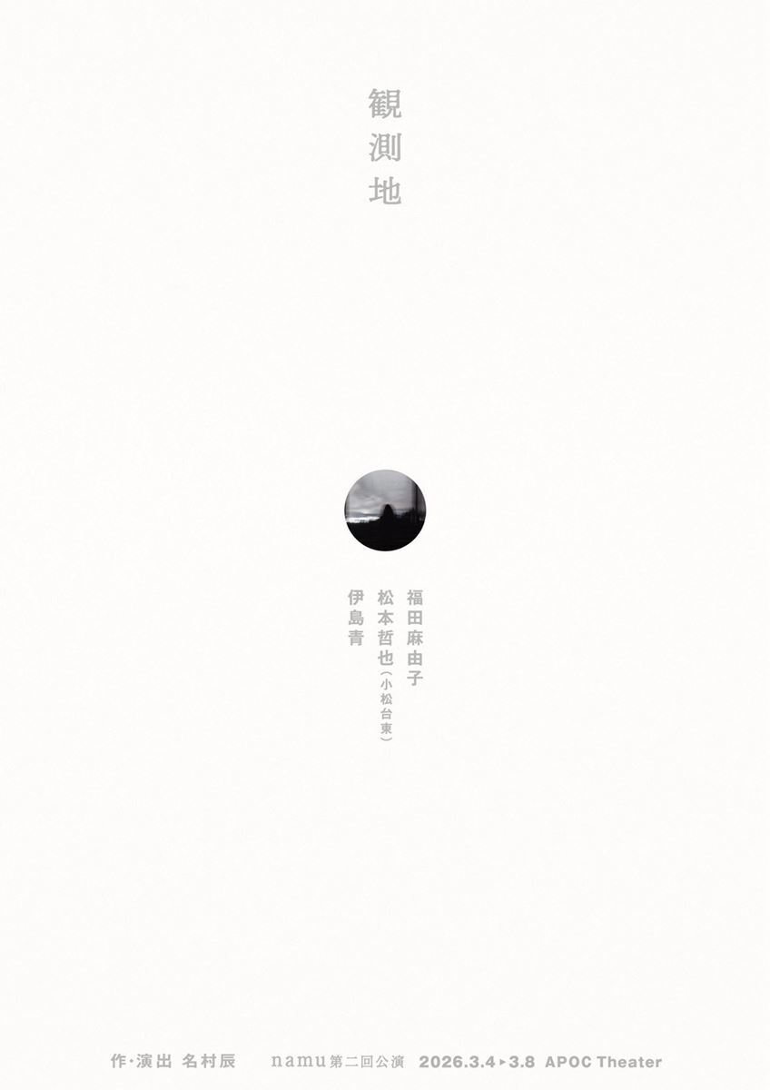 白地に小さな円。まるで覗き穴のようなそこから見えるのは、どこかの風景でしょうか。タイトルやキャストなど必要な情報はすべて書かれているけれど、ごくごくシンプル。でありながら、決して仮チラシではないと思える作り込みを感じます。裏面には英文と、こちらもはっきりとはわからない写真が、縦に。namu『観測地』の作・演出を手がける俳優の名村辰さんと、デザインを担当した金子裕美さんにお話を聞きました。