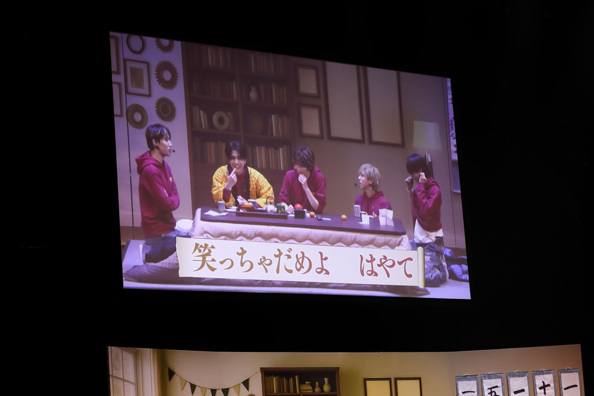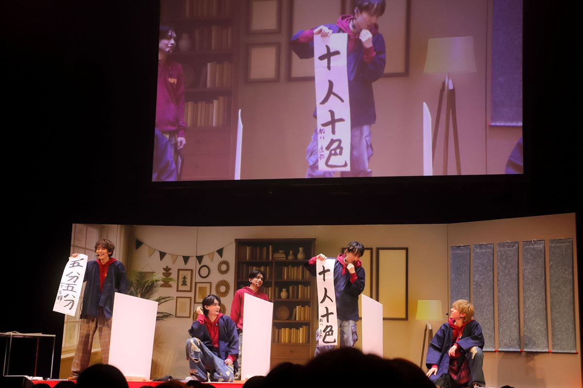 3本目の企画は、「そのエンディングをむかえろ 即興わぶ劇場」。これは、それぞれがカードを引き、そこに書かれている役を演じながら、指定されたエンディングに向けて、即興劇を演じるというもの。颯が「俳優が3人いるんで」と自信を見せると、陽向が「4人いるから」、直弥が「5人おるから」とすかさず訂正。テンポのいい掛け合いで笑わせつつ、5人が役の書かれたカードを引く。