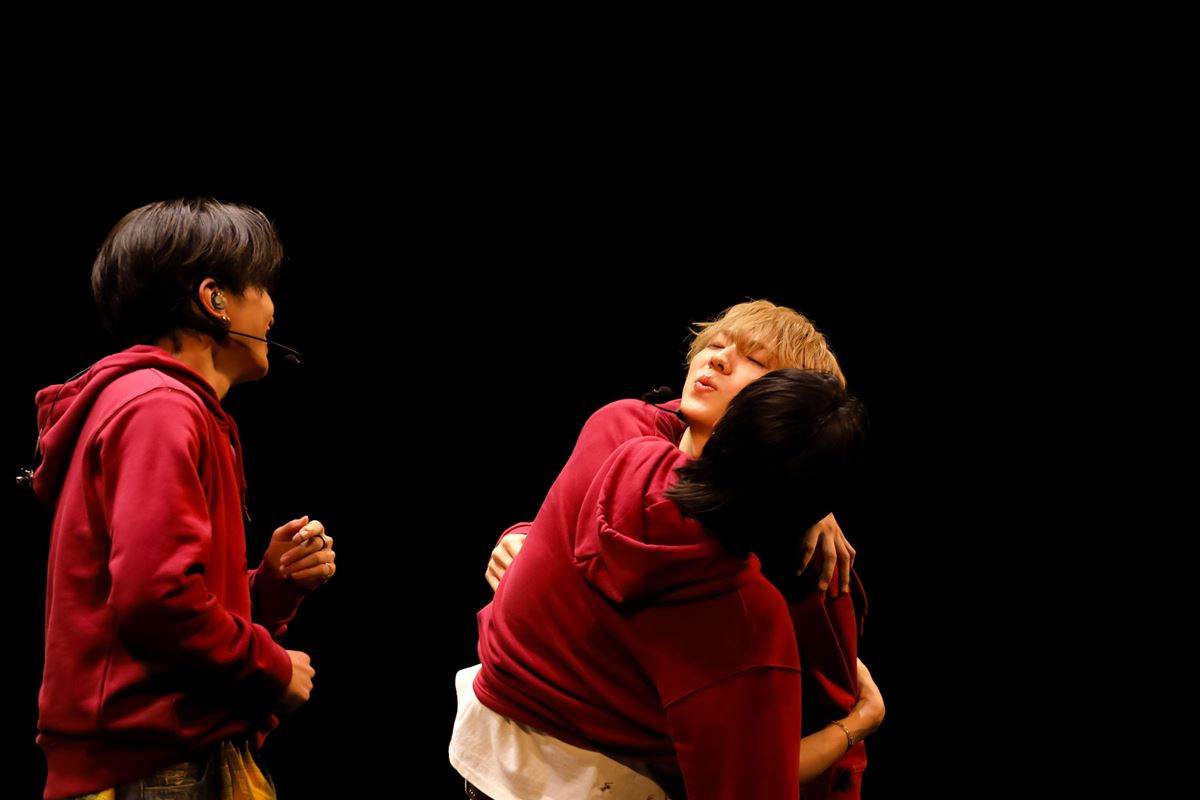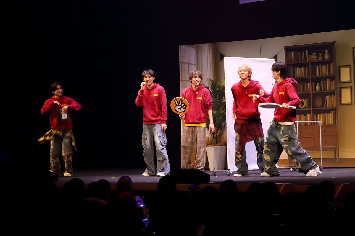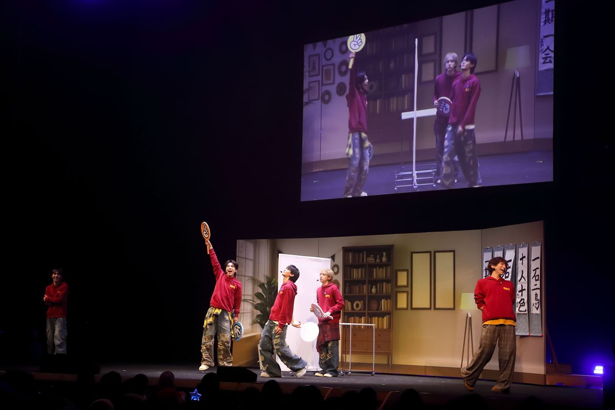 ここで予想外の名演技を見せたのが、マドンナ役の陽向だ。長い髪を撫でるような仕草で、クラスのマドンナ感をアピール。マドンナに手を出そうとするヤンキー役の直弥を「やめて」と拒む声も仕草も色っぽくて、STARRYから黄色い声が飛ぶ。話の流れは、文化祭でクラスの出し物として演劇をすることに。マドンナを救う勇者の役に優斗が抜擢され、オタクらしく「デュフフフ」と笑う。その憑依っぷりは、さすが芸歴15年。必死に笑いをこらえる颯をよそに、場内は爆笑の嵐だ。