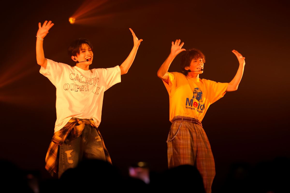 まだ幕開けから30分という序盤で、すでに6曲をパフォーマンスした5人はすっかり汗だくに。「汗かいたから着替えさせてや」と言う陽向を間に挟んで、直弥と池田優斗が「連れてくわ」と引きずるように連行。残ったリーダーズの幸輝と颯が漫才調のトークで場をつなぐ中、颯がイタズラ顔で「無茶ブリもしていい?」と一言。「今年頑張ったことで一発ギャグって言ってなかった?」と幸輝に恐ろしいパスをぶちかます。