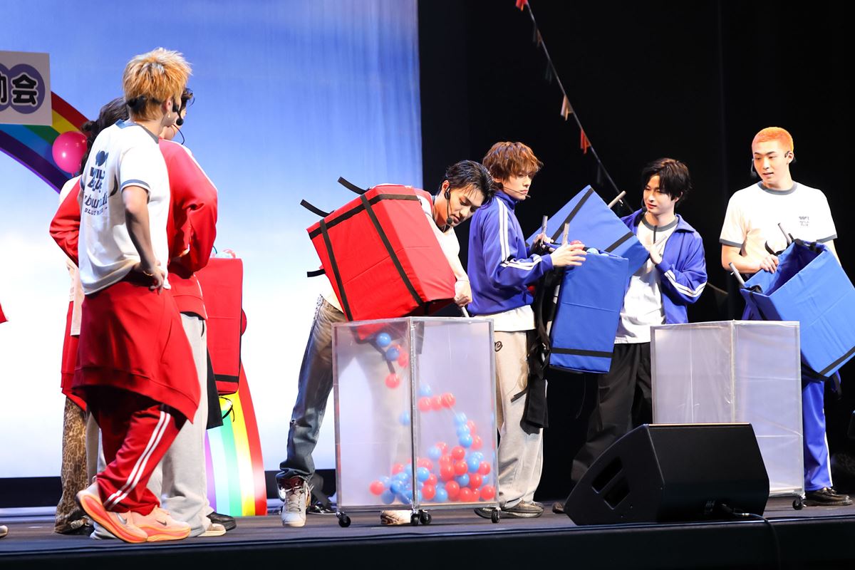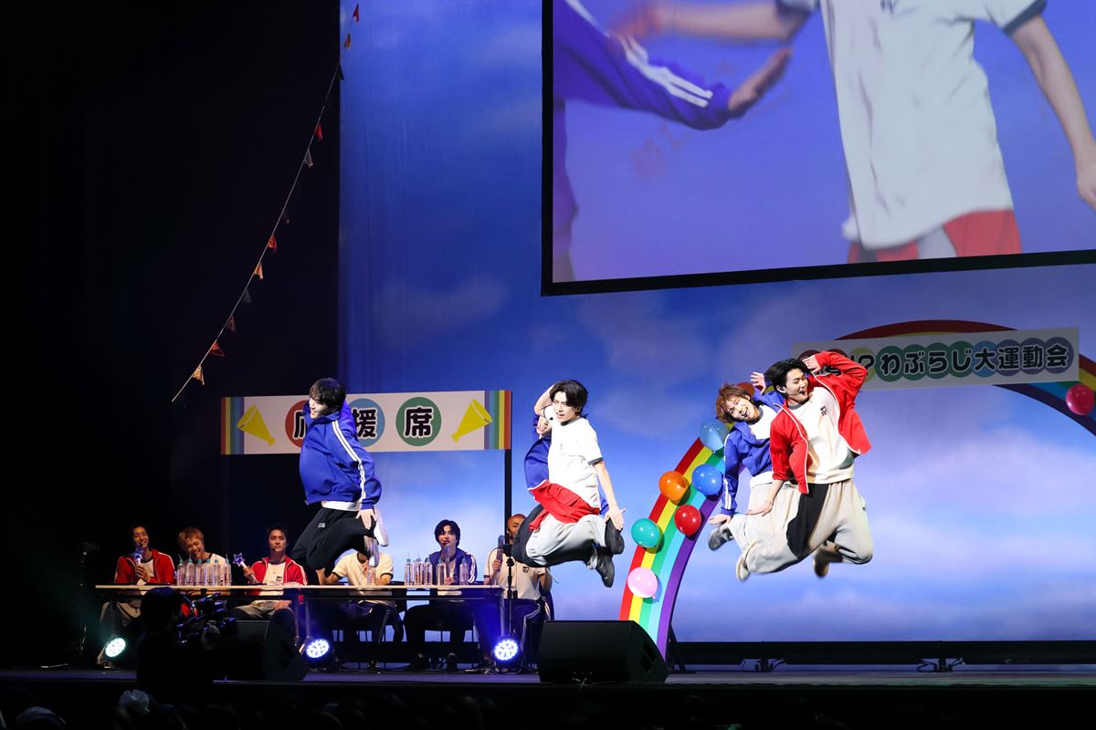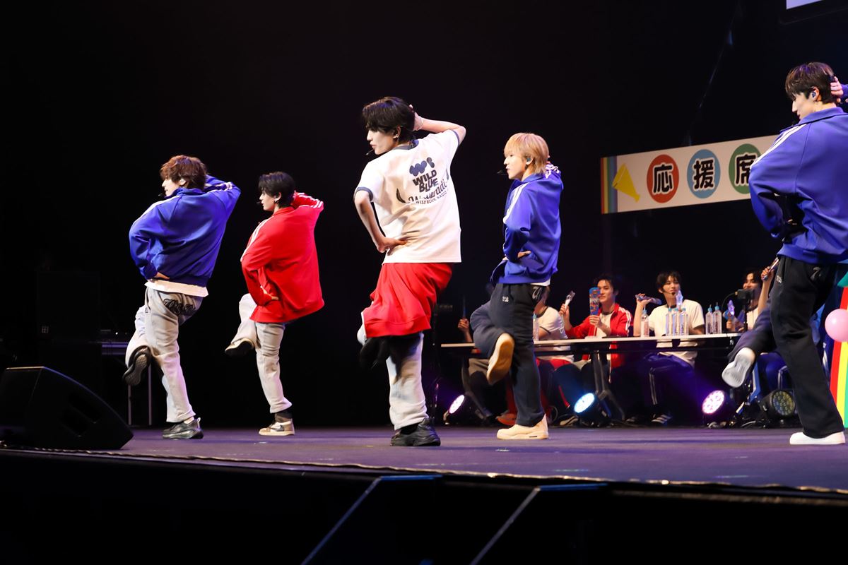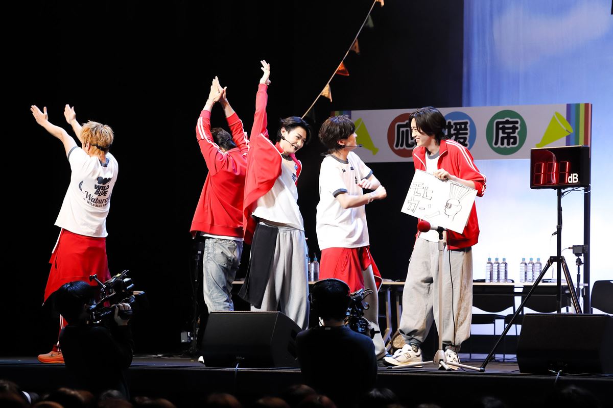 今回のゲストは、7ORDER、BALLISTIK BOYZ、WATWINGと、ボーイズグループ戦国時代を共に競うライバルたち。でも、こんななごやかな光景を見ていると、むしろみんなで一緒にシーンを盛り上げる仲間といったほうが近い気がします。まるでSTARRYのようにキラキラと目を輝かせる仲間たちの声援に支えられ、わぶの5人もいつも以上に楽しそうな表情に。普段のライブとはまたちょっと違うパフォーマンスも、大運動会ならではの醍醐味です。