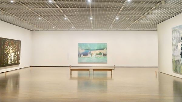 映画『13日の金曜日』などから着想を得たという小舟は、彼の作品に頻出するモチーフ で、何か物語が展開するかのようにも読み取れる。また、湖面を境に画面上下で描かれる実像と鏡像の境はあいまいで、どこか夢の中にいるような感覚にかられる。同作は、2015年のクリスティーズ・オークションで、約2,600万米ドル(当時約30億円)で落札されたことでも知られる作品だ。
