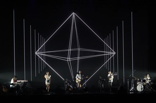 座っていた椅子を下げ、しばし暗転。「121位」、「オリーブをくわえた鳩が飛ぶ日には」、「マリッジブルー」、そして未発表曲「無題」とつづく。真っ赤なスクリーンを舞台にヘヴィなサウンドが流れ、瞬間的な強さを放ちながら和田が踊る。そこから青いスクリーンへと変わり、ギターのオータケが鉄琴を、ベースの劔がコントラバスを、間奏でキーボードの楢原がバイオリンを奏でる転換は見事だった。リズミカルなナンバーに、自然と身体が揺れる。映像が流れ、「これからどう生きていきたいですか?」という質問を、ライブに関わるスタッフ全員に和田が投げかける。家族のこと、仕事のこと、毎日のこと。様々な答えに対して明るく聞き回ることができる和田の問いかけに、観客も同じ問いを自らに投げかけていたように思う。