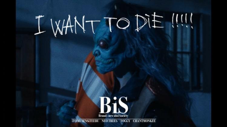 「I WANT TO DiE!!!!!」は8月19日にリリースされる新作音源「ANTi CONFORMiST SUPERSTAR」の収録曲。ティザー第3弾まででBiSがミュージックビデオの撮影で新潟・佐渡島を訪れたことがアナウンスされ、MV本編でカットされたという手錠で拘束されたシーンのほか、メンバーが正体不明の人物を集中攻撃している空撮映像が公開された。第4弾は謎の怪物がチャントモンキー、ネオ・トゥリーズ、トギー、イトー・ムセンシティ部の首を締めるシーンで構成されている。苦渋の表情を浮かべるメンバーの中で、イトーは首を絞められながら“アヘ顔ピース”をしている。MV本編は本日8月5日24:00にYouTubeでプレミア公開される。