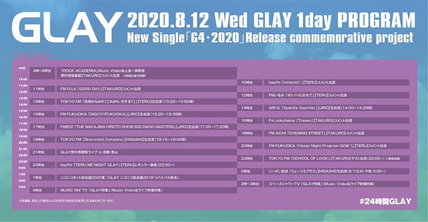 この企画では8月12日から8月13日にかけて、24時間GLAYがさまざまな媒体で、多様なコンテンツを発信する。同時に発表されたタイムテーブルには、全国各地のラジオ番組へのメンバーの生出演やコメント出演、テレビ番組の映像出演から映像特集など、盛り沢山な内容が記載されている。