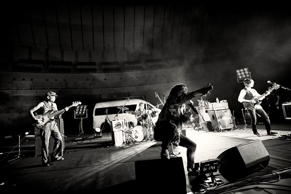 開演時間の19:00、待機中の映像(過去の写真のスライドショー)が切り替わり映し出されたのは、クルマの助手席からのアングル。グレートマエカワ(ベース&リーダー)が運転するハイエースが横浜アリーナに到着し、そのままホールの中に乗り入れて行く。横アリの広いフロアの一角に楽器や機材や照明が並んでいる、その後ろにハイエースを駐めると、4人はクルマを下り、持ち場につき、鈴木圭介(ボーカル)の「どうもフラワーカンパニーズです! ようこそ、横浜アリーナ!」という挨拶から、1曲目『白眼充血絶叫楽団』になだれこむ──というオープニング。
