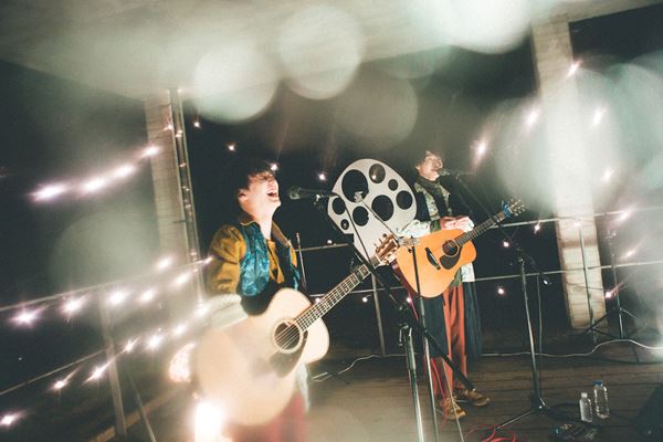 暗闇に輝くキノコのライトと、星のように見える無数の小さなライトが可愛い、屋外のステージ。茶系のシャツにボタニカル柄のベスト、えんじのパンツの雅功。衿と袖口がボタニカル柄な黒系シャツと、茶色いパンツの彪我。フォークロア調のふたりの衣装が、周りの雰囲気としっくりと合っている。1曲目はアコースティック・バーションの「きみでした」。甘さと力強さが混じるふたりの声、心に直接響くようなギターが心地よい。「夜の配信」を意識してか、高すぎないテンションがじんわりしみる。