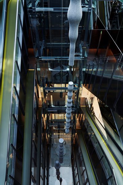 さらにGYREのアトリウムには、彫刻作品《Silhouette》がインストールされている。これは一昨年、東京・スパイラルホールと京都 ・ロームシアター京都で行われた、ピアニストの中野公揮氏のコンサートの舞台美術作品として登場したもの。音の旋律を元にした曲線でつくられた回転体とそのボリューム、炭化ケイ素の粒に覆われて光に反射する表皮が魅力的な作品だ。