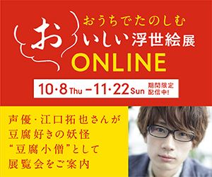 江戸には、すしやそば、天ぷらなど、おいしいものがたくさんある。デジタル展覧会では、こうした江戸の食文化を表現した「浮世絵」を、声優の江口拓也が豆腐の妖怪「豆腐小僧」に扮してナビゲート。森アーツセンターギャラリーで撮影された作品紹介映像と作品解説を楽しみながら、家にいながら展覧会の魅力を体験できる。