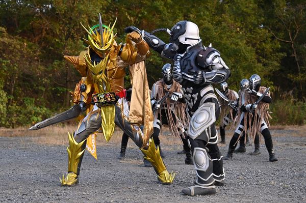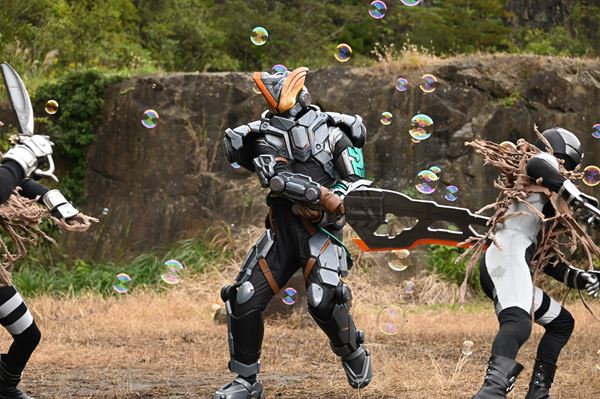 水の剣士・仮面ライダーブレイズは、敵に囲まれながらも、水の聖剣・水勢剣流水(すいせいけんながれ)を手に冷静沈着に立ち構えている。また、雷の聖剣・雷鳴剣黄雷(らいめいけんいかずち)を持ちながらアリメギドの攻撃をものともせず反撃しようとしているのは、雷の剣士・仮面ライダーエスパーダだ。