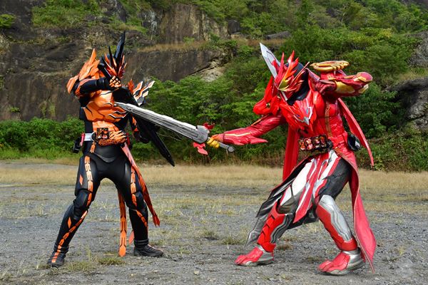 土の剣士・仮面ライダーバスターは、巨大な聖剣・土豪剣激土(どごうけんげきど)を軽々と振り回し敵を翻弄している。さらに、唯一の双刀でもある風の聖剣・風双剣翠風(ふうそうけんはやて)を両手に構えながら敵をなぎ倒しているのは、風の剣士・仮面ライダー剣斬である。そして、剣と銃に変形する音銃剣錫音(おんじゅうけんすずね)を手に敵を睨みつけている音の剣士・仮面ライダースラッシュ。