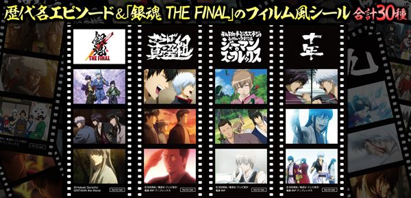 発表されたフィルム風シールは合計30種。この内の25種類は投票総数12万2843票を記録し、全367話と劇場版2作から厳選された77エピソードで争われた「アニメ銀魂 名エピソード総選挙」での上位を獲得した回の場面が切り取られている。さらに今回の『銀魂 THE FINAL』の名シーンを集めた5種も含まれる予定だ。