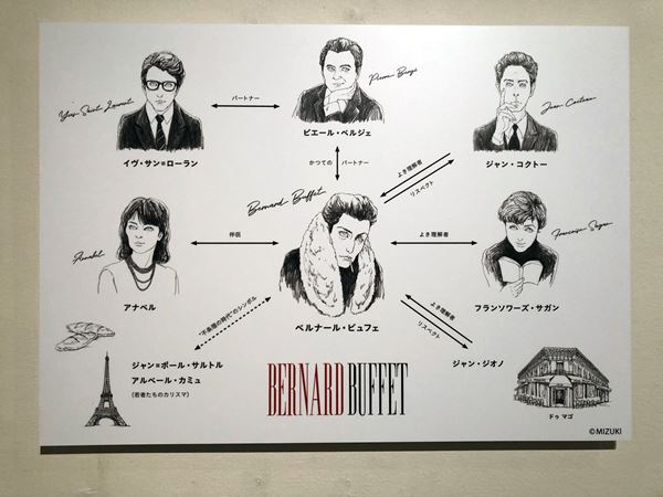 ビュフェを語る上で欠かせない人物が、実業家にして文化人で、政治家とも密接なコネクションを持っていたピエール・ベルジェだった。社交的なベルジェは人付き合いが苦手なビュフェを様々な人々に紹介し、公私ともに手厚くサポートをしていた。19歳で個展を開けたのも彼の尽力にほかならない。