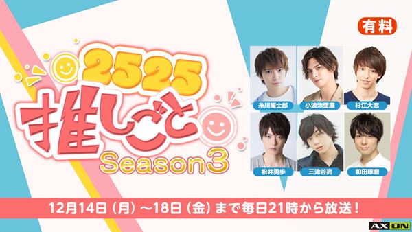 12月14日(月)から動画サービス「ニコニコ」の「ニコニコ生配信」にて、2.5次元俳優たちが出演する交流型配信バラエティ番組『2525推しごと』season3が12月18日(金)までの5日間に渡って配信されることが決定した。