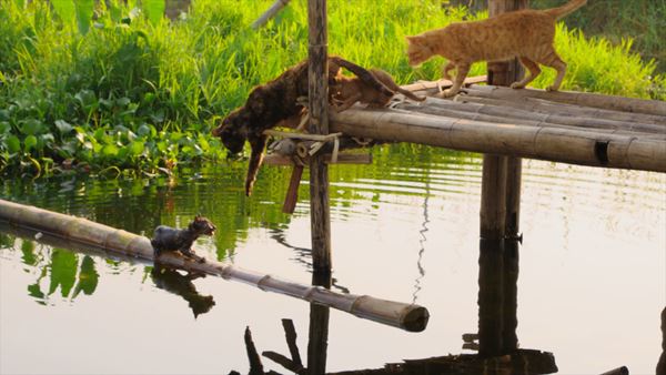 公開された映像では、湖上の高床式家屋で生活するネコの一家が移動しようとしたその瞬間、子ネコのシュエが足を滑らせて湖に落ちる姿が映し出される。シュエは近くに浮かんでいた竹にしがみつき必死に助けを求める。母ネコのメーワーが精一杯手を伸ばして助けようとする姿に、思わず「頑張れ!」と応援せずにはいられない。