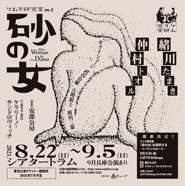 主人公は、ある砂丘へ昆虫採集に出かけた男。彼は砂穴の底に埋もれる一軒家を訪れることになる。そこには一人の寡婦が住んでいた。家の中にはひっきりなしに砂が流れ込み、女はひたすら砂を掻き出し続けている。男は脱出を試みるが、女や村人たちに逃げ道を阻まれ、閉じ込められてしまうのだった。複雑怪奇な作品かと思いきや、リアルな心理描写や肌ざわりが、読むものを惹きつけて離さず、その顛末がどうなるのか気になって仕方がない中毒性を持つ「砂の女」。公演についての最新情報は、キューブHPにて順次公開される。また、公演に先んじて、6月にはケムリ研究室主催のリーディング&トークイベントの開催も決定した。詳細は続報を待とう。