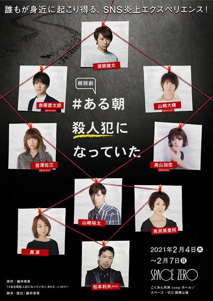 2月4日から7日に渡って上演された『朗読劇#ある朝殺人犯になっていた』。原作はインターネットが一般化した現代社会の闇を、ユーモラスにミステリー仕立てに描いた藤井清美氏の小説だ。同氏の演出で上演された本作は、炎上に翻弄されながらも真犯人を突き止めていく臨場感たっぷりの新感覚朗読劇である。