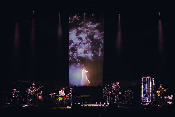 電話のベルが鳴り、後方のスクリーンに「もしもし、運命の人ですか。」と映し出されて、一曲目に披露されたのは穂村弘と歌詞を共作した「ルシファー」。〈羽の舞い散る夜に運命と出会ったの〉というラインに合わせて、羽の舞い散るスクリーンの後ろで白いドレス姿の吉澤が歌う、何とも幻想的なオープニングだ。
