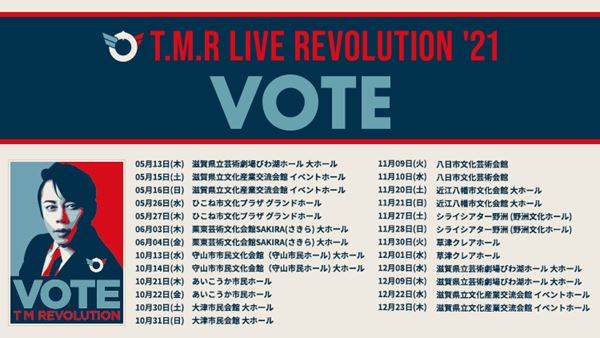 T.M.Revolution名義の単独ライブは、2017年5月14日の20周年ライブツアー千秋楽(さいたまスーパーアリーナ)以来となる。「T.M.R. LIVE REVOLUTION’21 - VOTE -」では、5月13日の滋賀県立芸術劇場びわ湖ホール 大ホールから、12月23日(木)開催の滋賀県立文化産業交流会館 イベントホールまでの全25公演を開催する。