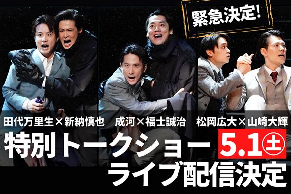 4月1日(木)に東京芸術劇場シアターウエストで開幕し、5月2日(日)まで予定されていた東京公演形17公演が中止となったミュージカル「スリル・ミー」。この度、田代万里生、新納慎也、成河、福士誠治、松岡広大、山崎大輝ら全出演者が登場する特別トークショーの開催が急遽決定した。