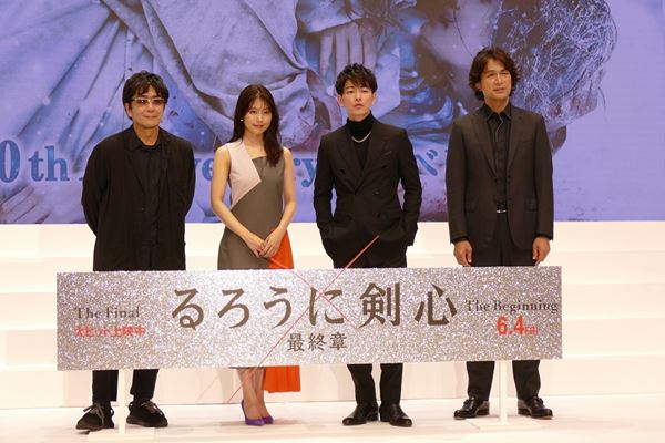 江口は「なかなかヘビーな仕事だった」と10年の旅路を回想し、「これが皆さんに届いて、楽しいと言ってもらえれば、(コロナ禍が明けて)健くんともいい酒飲めそう」と期待感。大友監督は「ここにたどり着くまで10年、戦ってきました。今思うと美しいプロジェクトだった」と振り返り、「最終的に『The Beginning』は過去のどの作品とも違っている。剣心のルーツを描かないと、剣心を描いたことにならないし、技術で撮るよりも、心で向き合わないといけない領域が多かった」と話していた。