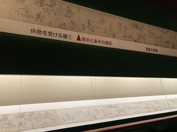 展覧会は、第1章「国宝 鳥獣戯画のすべて」、第2章「鳥獣戯画の断簡と模本―失われた場面の復原」、第3章「明恵上人と高山寺」で構成。第1章が「国宝 鳥獣戯画のすべて」なのだから、第1章からいきなり展覧会のクライマックスがやってくる。まずは、「鳥獣戯画」といったときに一番はじめに思い起こされる人気の高い甲巻の展示だ。