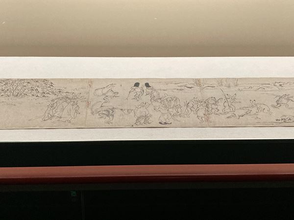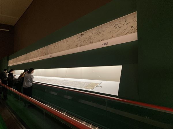 甲巻には、ウサギ、サル、カエルなどの動物たちが擬人化され、追いかけっこをしたり、水遊びをしたりする姿が生き生きと描かれている。「鳥獣戯画」の中でも最も有名なシーンが収められているこの巻の展示ケースの前には、何と「動く歩道」が設置され、鑑賞者はゆっくりと動くこの歩道から、全場面をじっくりと鑑賞することができる。