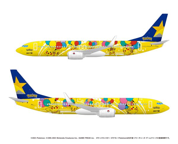 本日の羽田、沖縄間の就航が初飛行となる「ピカチュウジェット」は、今後沖縄(那覇・宮古(下地島))発着路線を中心に、スカイマーク便が就航する他の空港へも運航が予定されている。機体にはピカチュウと同じ黄色でフルペイントされた下地の上にカラフルな風船を付けたそらとぶピカチュウが左右に合計10匹描かれている。