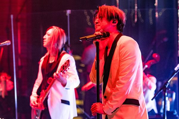 夜空をイメージしたかのようなステージセットの中、美しい鍵盤ソロが奏でられると「傷だらけの太陽」で本公演は幕を開けた。ストリングスを加えたスペシャルなアレンジで演奏されると、TERUの「Thank you」の声に続き2曲目の「BLAST」に突入。赤い照明に照らされ、TERUもタンバリンを叩きながら力強く歌い上げる。