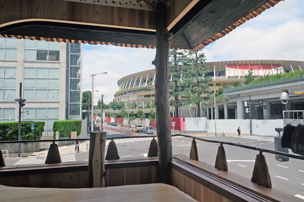 5人も入れば満員になってしまう4畳半の茶室の窓からは、数万人が収容できる巨大な国立競技場を眺めることができる。なお、五庵への入場は事前予約制だ。
