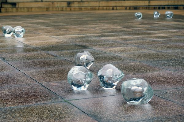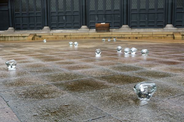 冒頭の写真の作品は、湯島聖堂を会場にした宮永愛子《ひかりのことづけ》。回廊の中央に透明度の高いガラスを置き、日々変わっていく様々な光を集め、分散させている。