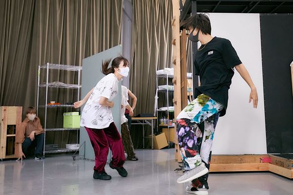 この日、行われたのは3度目の通し稽古。通常、「3度目の通し稽古」と聞くと作品は固まりつつあるのだと受け取るが、梅棒の場合は別。稽古の冒頭で作・総合演出の伊藤今人(梅棒)がキャストに「前回の通し稽古から結構変わっていますが、今回やってまた次の通し稽古に向けて修正をしていきます」という話をしていたが、つくっては壊し、つくっては壊しを重ねながら、梅棒ならではの、台詞がないのにわかりやすくて、シンプルなのに深みもある、あの舞台ができあがっていく。