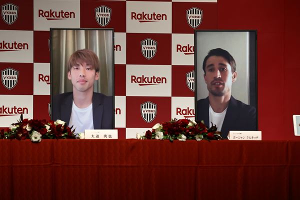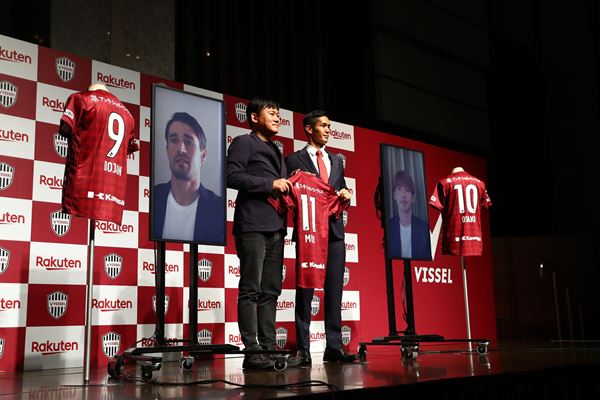 記者会見には三木谷浩史会長も同席。ドイツで7年半戦い日本代表のエースに君臨する大迫にブンデスリーガ(ドイツ)、プレミアリーグ(イングランド)、ラ・リーガ(スペイン)を渡り歩いた武藤、バルセロナで数々の最年少記録を塗り替えて、その後ローマやミラン、アヤックスなどでプレーしたボージャンという大型補強の意義を尋ねられると、このようにコメントした。