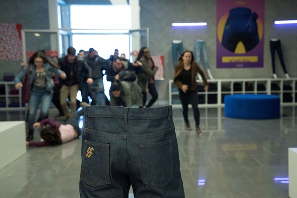 これまでトマトや、タイヤ、ソファなど思いもよらぬモノが、人間に襲いかかってきたファンタ系ホラー映画。その系譜を継ぐ最新作として今回ラインナップされているのが『キラー・ジーンズ』である。タイトルの通り、「ジーンズが人間に襲いかかる!」というワンアイディアで押し切ってしまう作品だ。とあるアパレルメーカーが開発した誰にでもフィットする魔法のようなジーンズ『スーパーシェイパーズ』。新アイテムの発売に向けて、店舗で従業員たちが忙しなく準備をしている中、ジーンズはひとりでに動き出し、次から次へと人々を血祭りにあげていく。
