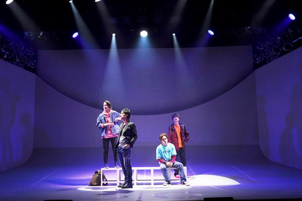 取材日は昼夜ともに「EAST」の上演回で、矢田悠祐、ルーク・ヨウスケ・クロフォード、風間由次郎、木戸邑弥が出演。高校の友人と数年ぶりの再会にはしゃぐ一方で、互いに訪れた“変化”を感じ取り「当時の輝かしい日々(Glory Days)には戻れない」──と悟る若者たちの成長や葛藤をステージ上に立ち上げた。