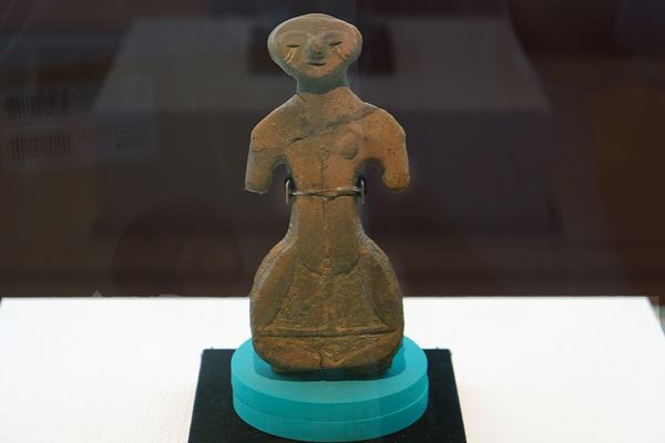 展覧会はプロローグ、エピローグを含めて全6章で構成される。入口で鑑賞者を出迎えるのは、《土偶(多摩ニュータウンのビーナス)》。今から約5380~5320年前、縄文中期に作られたと思われる土偶で、目の下にある2本の白い線は彩色の跡と考えられている。