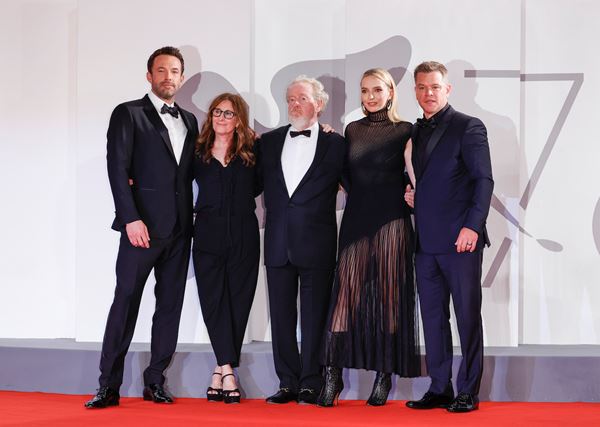 ヴェネチア国際映画祭のベントに出席した際の写真/左からベン・アフレック、ニコール・ホロフセナー、リドリー・スコット、ジョディ・カマー、マット・デイモン (C) 2021 20th Century Studios. All Rights Reserved.