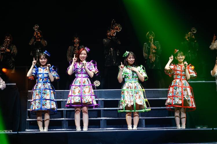 ライブ後半戦は坂本のソロ曲「Bunny」のパフォーマンスでスタート。ドレッサーに向かって歌ったり、ソファに座って歌ったりと、大型モニタや配信があるからこそのステージングを展開した。ステージ上部にレーザーで雨が描かれる中、ステージにはビニール傘を持った咲良が登場。エレクトロポップサウンドが新鮮な「One way LOVE…?」をダンサー民を引き連れて披露し、新たな魅力を発揮してみせた。続いてTEAM SHACHIはブラス民が鳴らすホーンサウンドのイントロから「JIBUNGOTO」をプレイ。来年2月16日にリリースする1stフルアルバム「TEAM」の衣装に身を包んだ彼女たちは、パワフルなダンスと歌でテンションを引き上げた。小出祐介(Base Ball Bear)が作詞を手がけた「HONEY」で艶っぽい歌とダンスを披露したTEAM SHACHIは、7年前に小出が提供した楽曲「colors」も続けてパフォーマンス。ギターがエモーショナルに響く「colors」では、ライトが赤、青、紫、緑に加え、チームしゃちほこ時代に活動をともにした安藤ゆずと伊藤千由李のカラーである黄色とピンクの照明もステージを彩った。