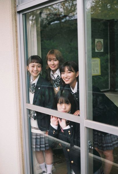 今回到着した制服写真は、卒業後10年ぶりに制服を着た3人と、同じく校舎に忍び込んでいた中井友望演じる現役女子高生・あすかの和気藹々とした姿を捉えたものだ。