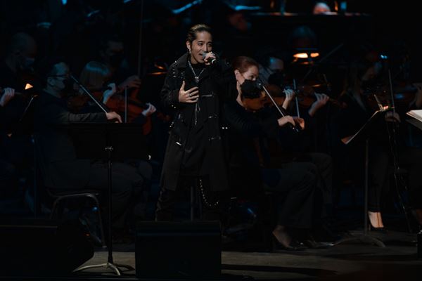 今回のコンサートでは、映像をバックに総勢100名を超えるオーケストラが数々の名曲を演奏。会場の雰囲気もピークに達しつつある終盤に、グラミー賞受賞指揮者アーニー・ロス氏に「今日は特別なゲストを招待しています。」と呼び込まれ、ステージへ現れたYoshにこの日一番大きな歓声が沸いた。