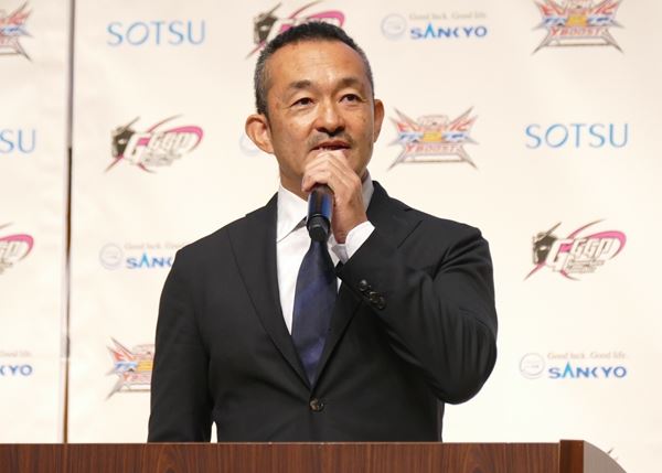 都内で行われた発表会には、株式会社創通・代表取締役社長の難波秀行氏、株式会社SANKYO・取締役副社長執行役員の富山一郎氏、スペシャルサポーターを務めるタレントの稲村亜美が出席。また、ゲストプレイヤーとして、よしきといそまるが駆けつけ、エキシビションマッチを披露した。