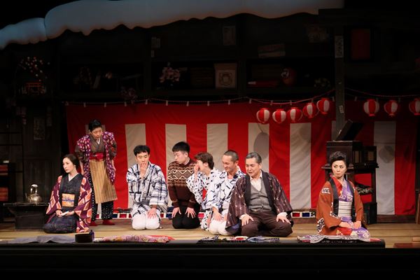こまつ座第140回公演『雪やこんこん』より、左から 真飛聖 安久津みなみ 藤井隆 村上佳 前島亜美 小椋毅 大滝寛 熊谷真実 撮影:宮川舞子