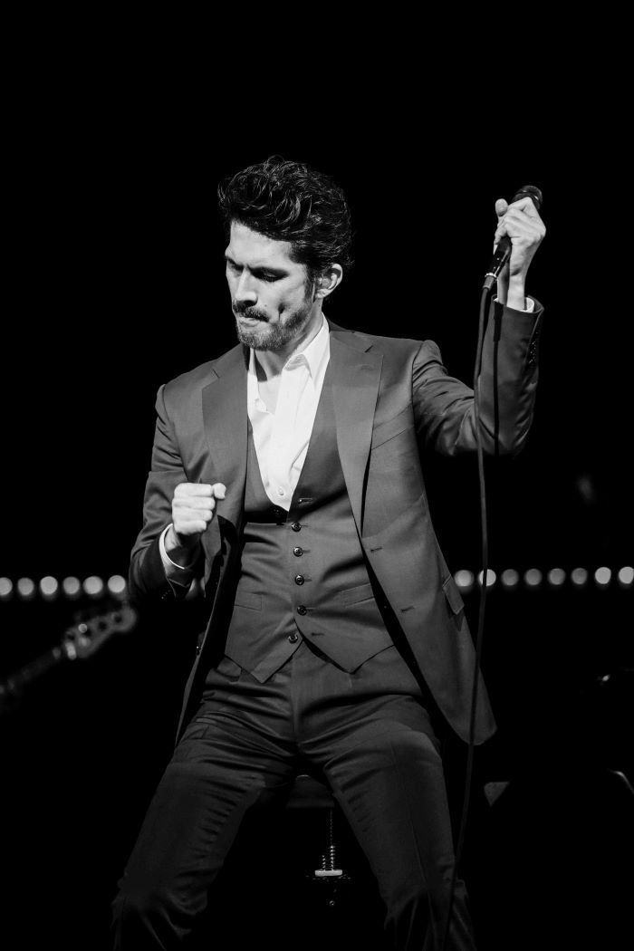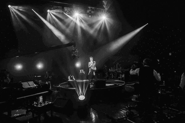 会場の壁にデコレートされた“Ken’s Bar”の電飾文字と、その手前でゆらゆらと揺れるキャンドルの炎が映し出されて始まった『Ken’s Bar 2021 -ONLINE-』。会場をバーに見立てて行われるライブ、だからとりわけめずらしいシーンというわけではないが、それはモノクロで、しかもこの演出は最後まで続くこととなる。誰も体感したことのない全編モノクロの『Ken’s Bar』は配信ならではの試みであり、意図的に彩りを排除したアイデアはじつに斬新なものとしてファンの目に映ったのではないだろうか。