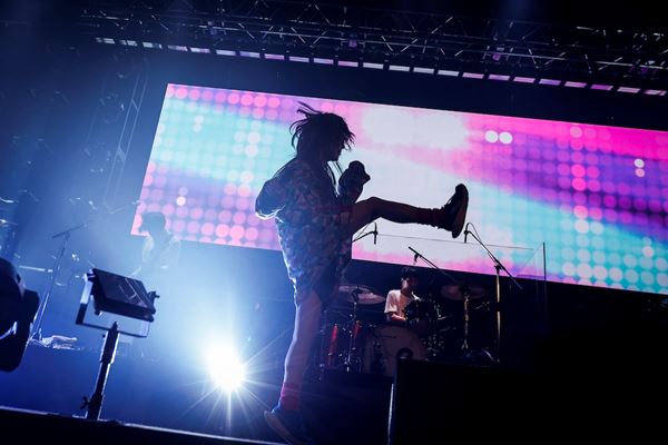 続けて、歪んだギターのリフが耳に残る「より道」や「明日の歌」「プラマイ」を歌い、会場の熱気を上げていく。MCを挟んで披露された「ハニーメモリー」や幻想的な映像と照明で彩られた「You & Me both」によって雰囲気を作ると、最新曲の「列車」「食べた愛」などを熱唱していった。