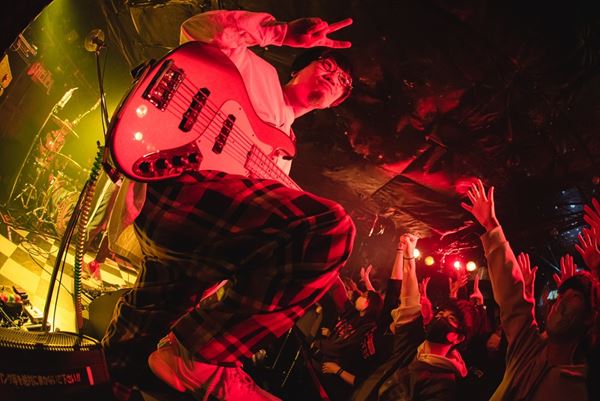 そして、今日のゲストである脳みそ夫を迎え、「脳みそ夫体操」を生演奏で初披露し、この曲も観客を巻き込んで大いに盛り上がった。再び「結果発表ー!」の声が響くと、リクエスト下位3曲、つまりマニアックなナンバーを投下するセクションへ。ラップを用いたリズミックな「FUCK OFF」、バンドの出自を露わにしたノイジーなハードコアを撒き散らす「Go Anti Go」、底抜けにアッパーな「Why can you stand?」と怒涛の3連発。