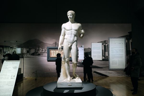 展覧会は、全5章構成。ヴェスヴィオ山の噴火CG映像や、噴火前のヴェスヴィオ山を描いたフレスコ画のある序章ののち、第1章「ポンペイの街──公共施設と宗教」へ。会場に入ると、筋骨たくましい大理石像が目に飛び込んでくる。
