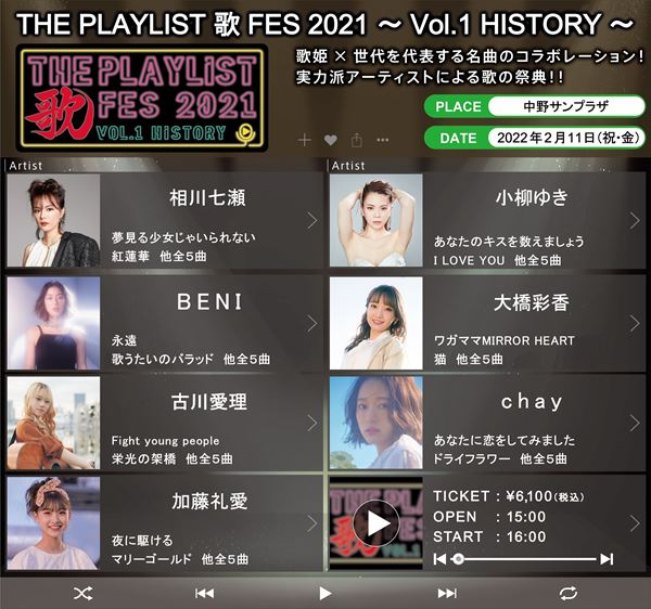 『THE PLAYLIST 歌FES 2021 ~Vol.1 HISTORY~』は、実力派アーティストの歌と歴代ヒット曲がコラボレーションする新しい形のフェスで、令和のヒット曲に出演アーティスト自身のヒット曲を織り交ぜた全35曲のプレイリストを作成し、1ステージでお届けする。